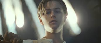 This is a low angle shot of Leonardo DiCaprio in Titanic. The low positon shot from below the character conveys what we're looking at as dominant, superior and special. In this case the low angle show is from Rose's point of view as she goes down in the lifeboat to the water - leaving him behind. The signal fireworks behind him with the night sky in the background represent his fate - he is like an Angel figure.